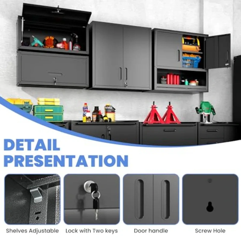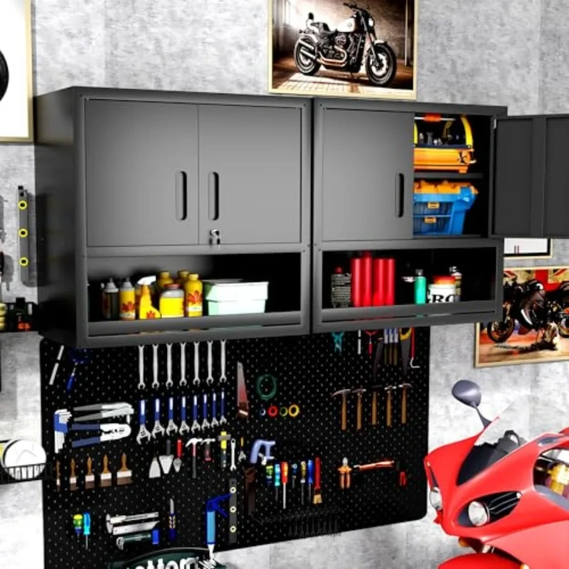 Transform your cluttered garage into an organized workspace with this wall-mounted metal cabinet set. Keeps your valuable tools secure behind lockable doors while providing both open and enclosed storage options for maximum versatility.